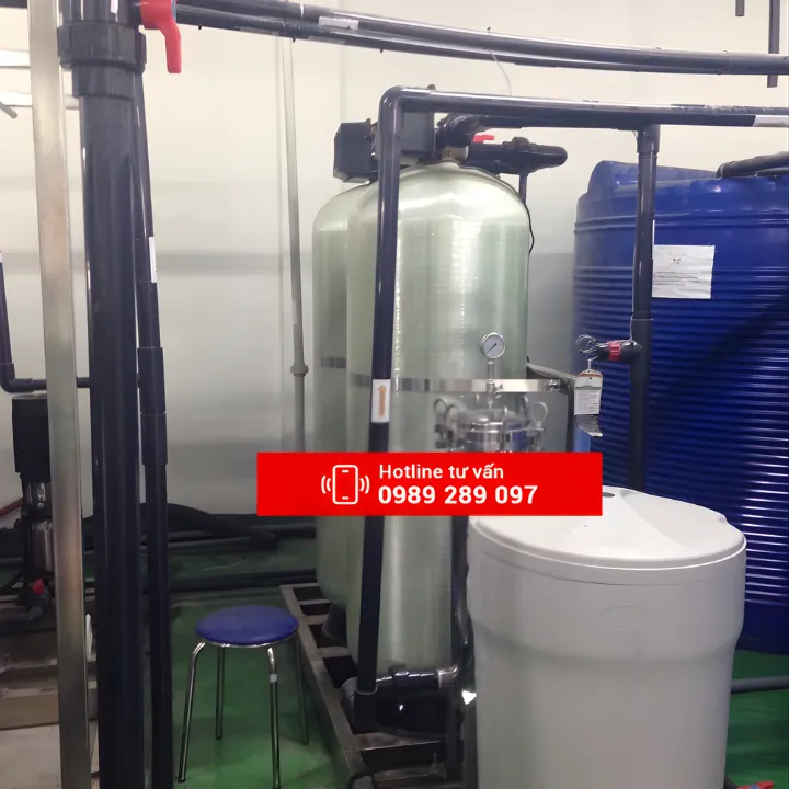 - Thiết bị làm mềm nước: Nước sau khi qua thiết bị xử lý than hoạt tính được đưa đến thiết bị xử lý mềm. Tại đây các thành phần làm cứng nước như Ca, Mg…được giữ lại đồng thời một số các cation khác cũng được giữ lại. Vật liệu được xử lý sau một chu kỳ hoạt động sẽ bão hoà và được phục hồi lại trạng thái ban đầu bằng việc hoàn nguyên bởi van tự động. Nước sau khi làm mềm độ cứng < 17mg/lít là cơ sở vận hành màng lọc nước thẩm thấu ngược (RO)