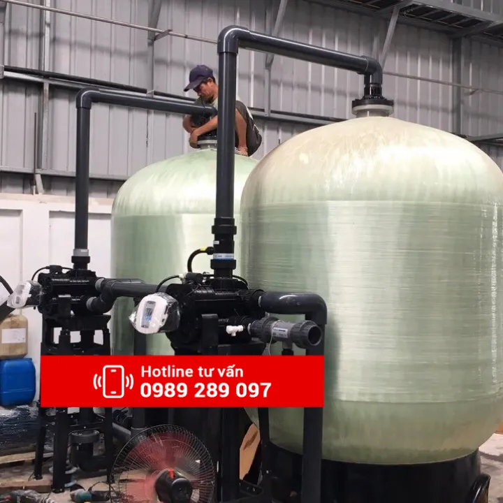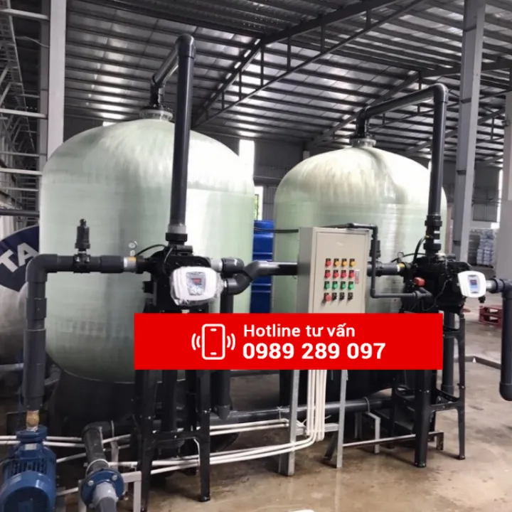 - Thiết bị làm mềm nước: Nước sau khi qua thiết bị xử lý than hoạt tính được đưa đến thiết bị xử lý mềm. Tại đây các thành phần làm cứng nước như Ca, Mg… được giữ lại đồng thời một số các cation khác cũng được giữ lại. Vật liệu được xử lý sau một chu kỳ hoạt động sẽ bão hoà và được phục hồi lại trạng thái ban đầu bằng việc hoàn nguyên bởi van tự động. Nước sau khi làm mềm độ cứng < 17mg/lít là cơ sở vận hành màng lọc nước thẩm thấu ngược (RO)